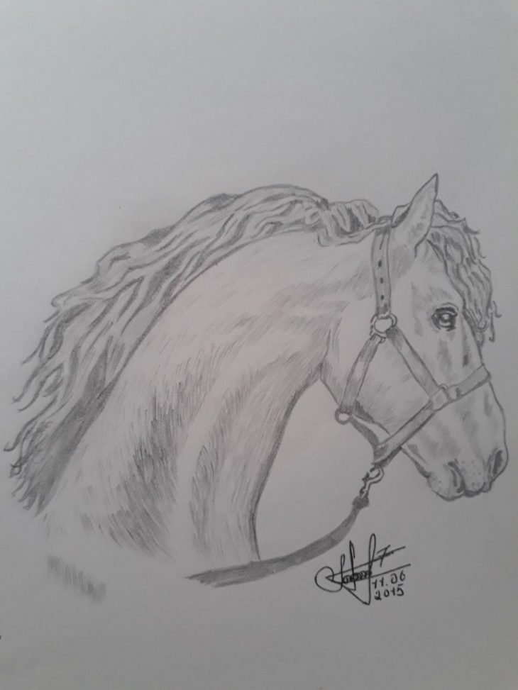 Рисунок лошади простым карандашом поражает своей реалистичностью и выразительностью. Узкие черные линии плавно контурят голову и передают ее изящные черты: мощную носовую часть, выразительные глаза и грациозные уши. Заметны также тонкие детали, которые придают изображению глубину и объем, такие как тень под глазами и световые отблески на морде. Кажется, что лошадь только что спокойно посмотрела вдаль и готова в любой момент прыгнуть вперед. Этот рисунок является идеальным выбором для любителей живописи, а также для тех, кто ценит элегантность и красоту лошадиных форм.