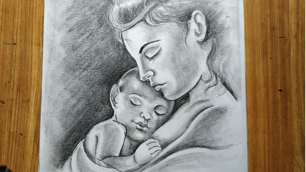 ![Рисунок матери и ребенка карандашом]()