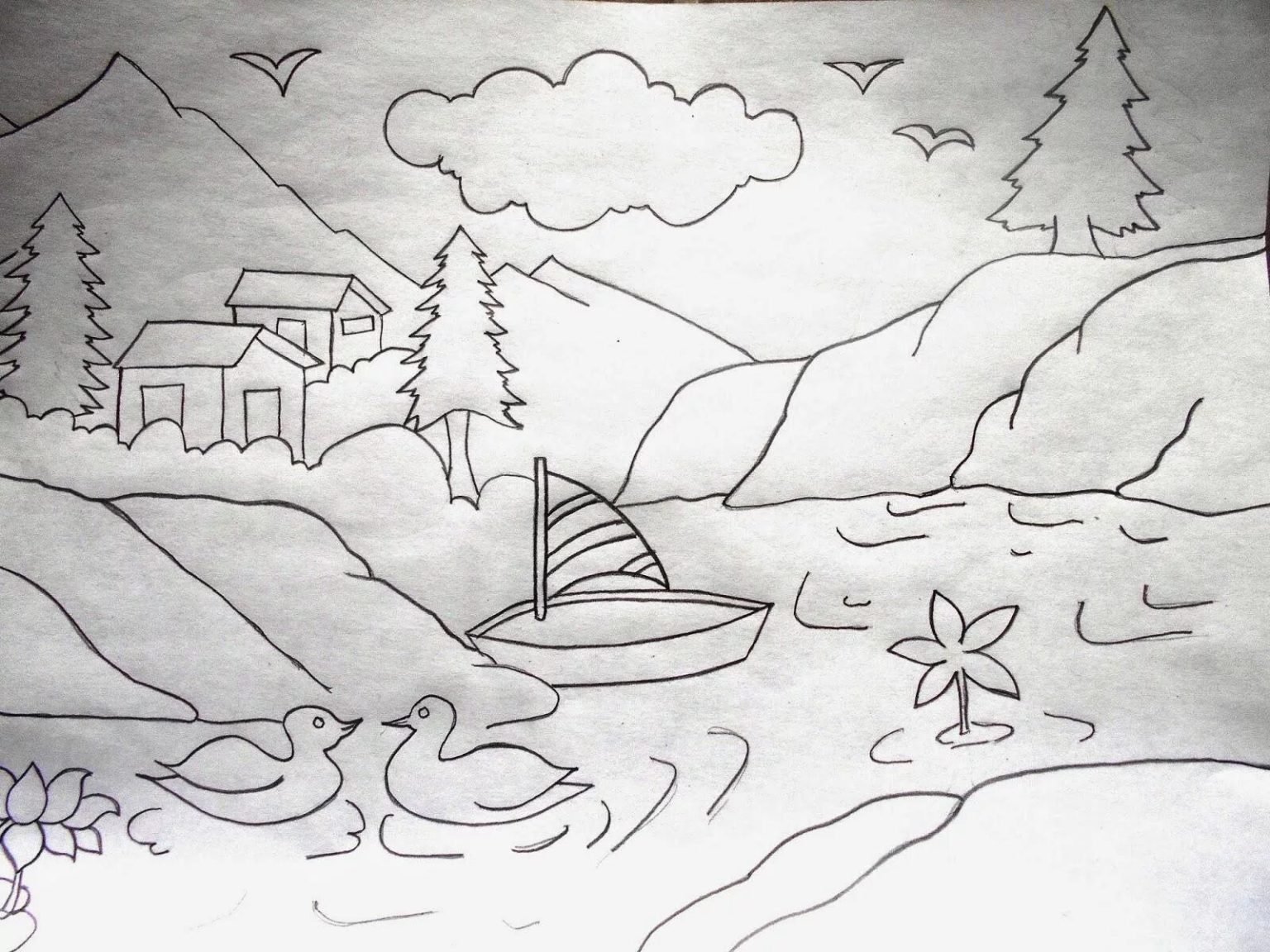 Детский пейзаж карандашом