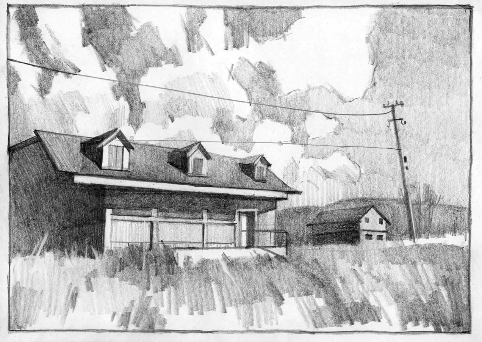 Деревенский пейзаж карандашом