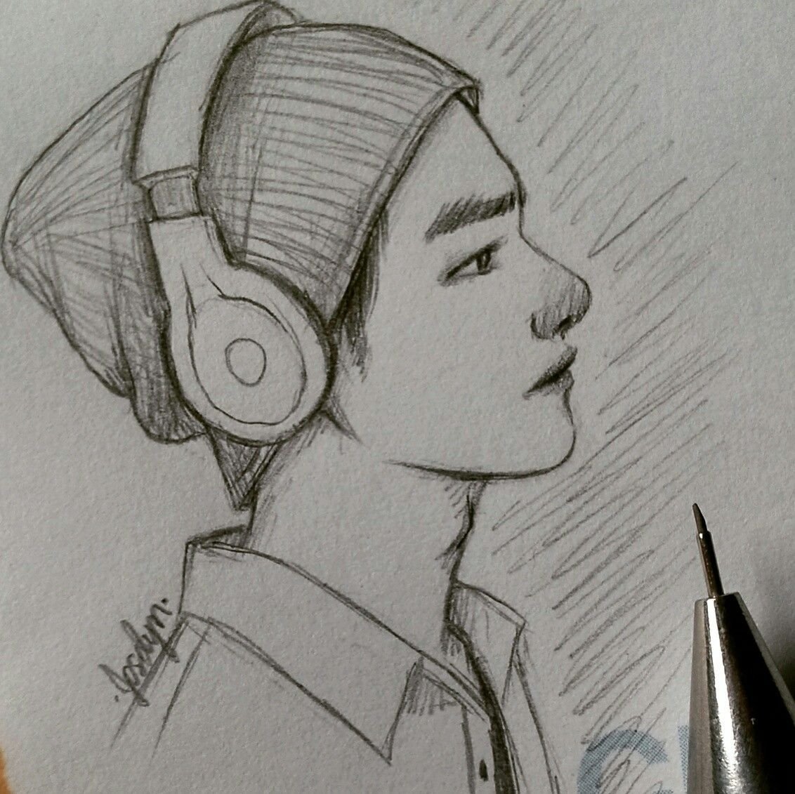 Аниме карандашом с наушниками