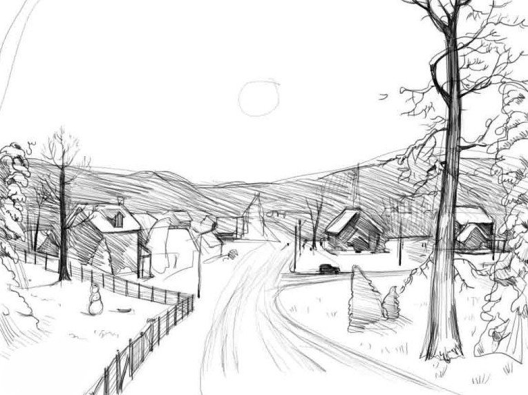 ![Зимний пейзаж рисунок карандашом]()