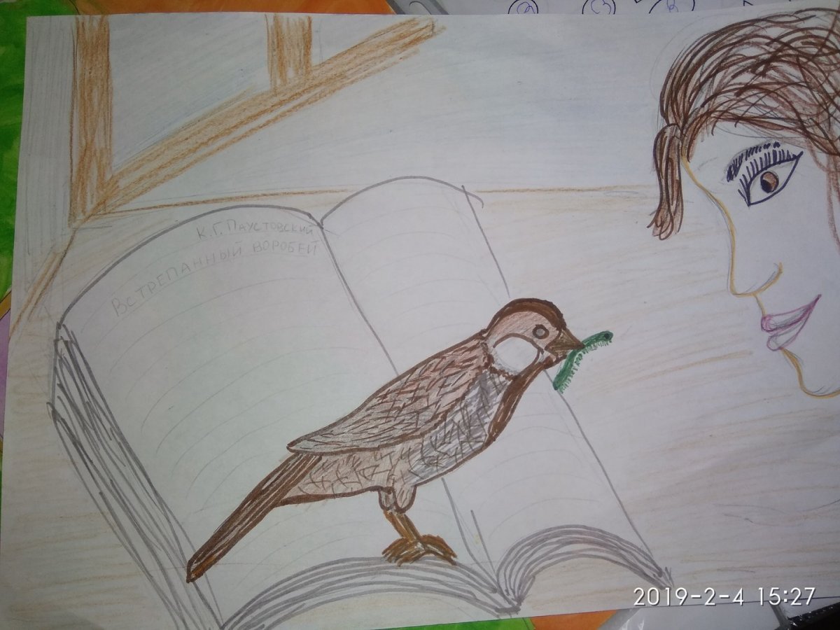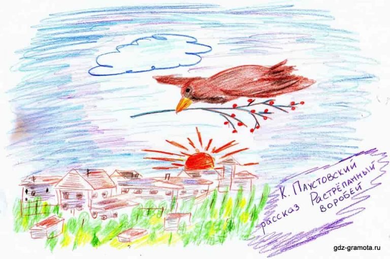 ![Рисунок к произведению Паустовского растрепанный Воробей]()