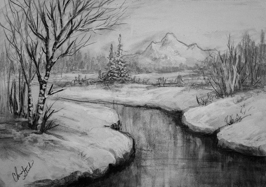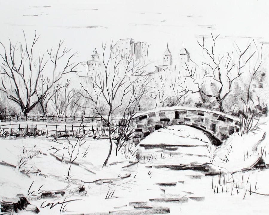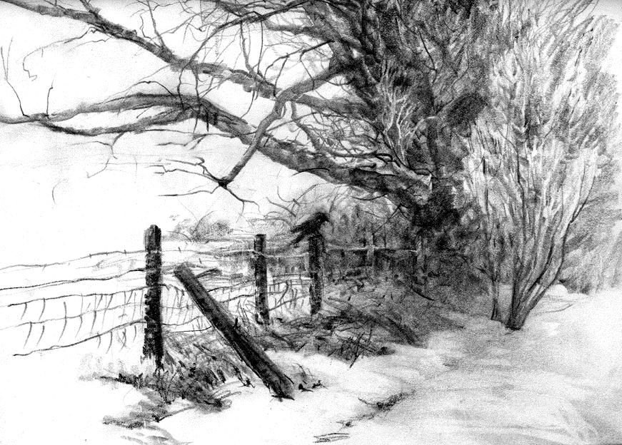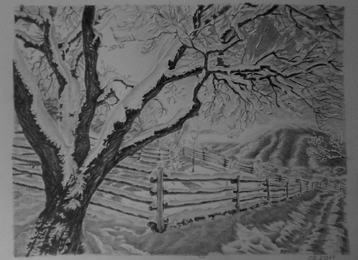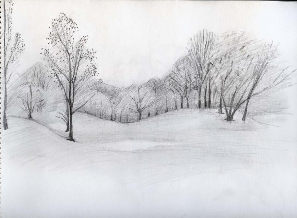Пейзаж зимы карандашом