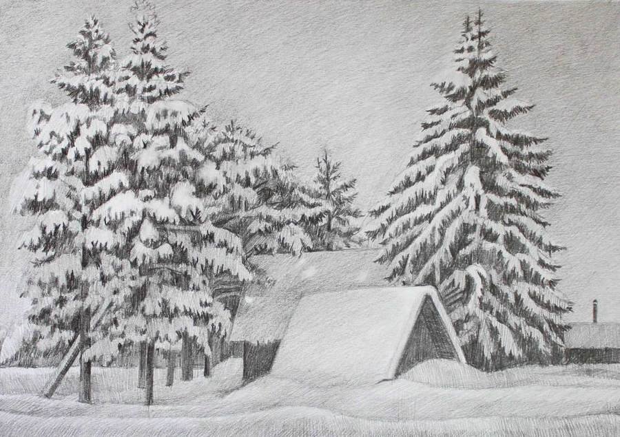 Зимний пейзаж карандашом легко