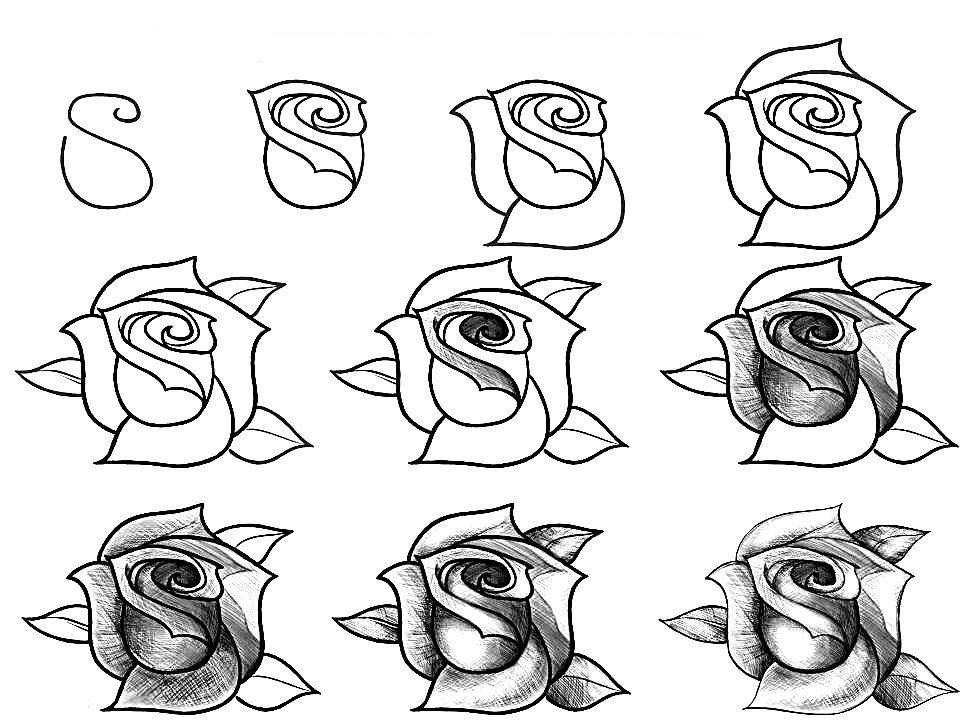 Схема рисования розы карандашом