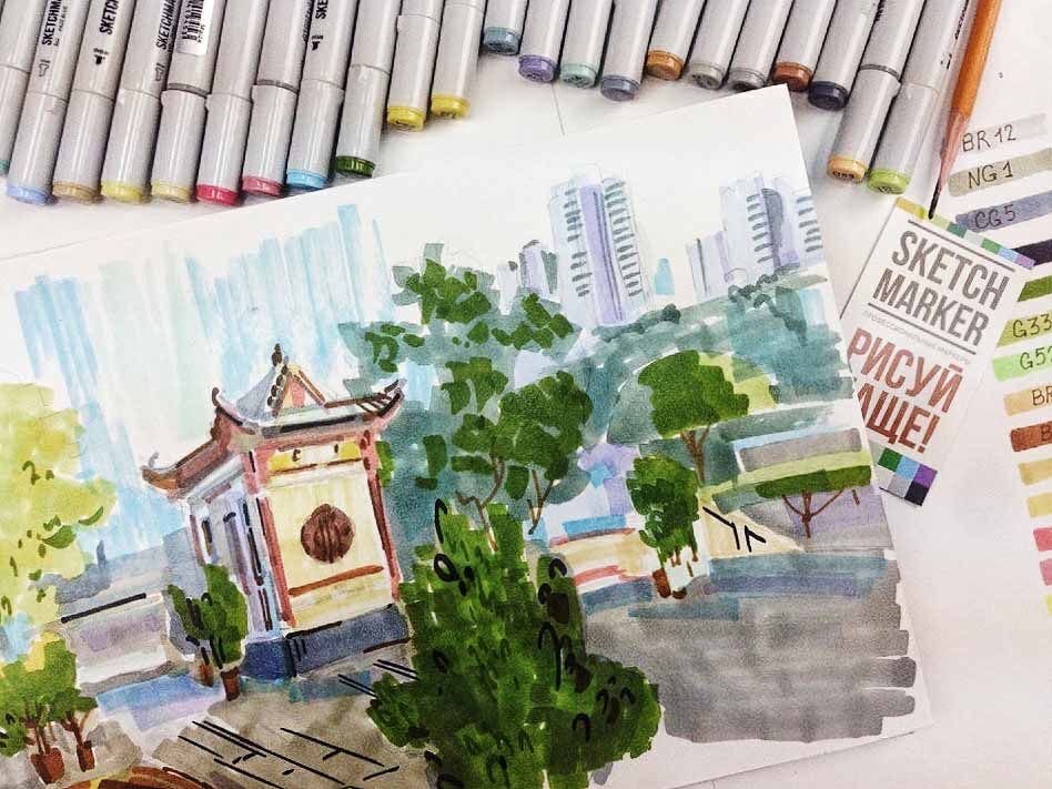 Пейзаж скетч маркерами