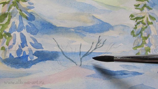 Зимний пейзаж акварелью для начинающих