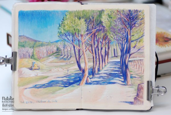 ![Пейзажи в скетчбуке цветными карандашами]()
