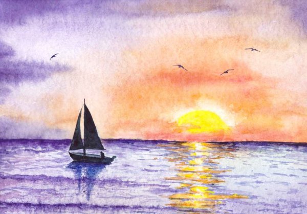 Закат на море акварелью