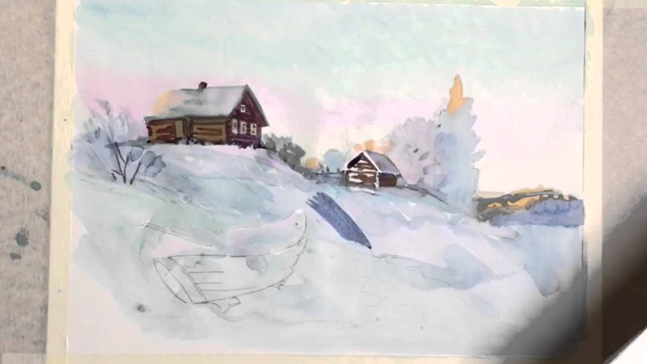 Зимний пейзаж акварелью поэтапно для начинающих