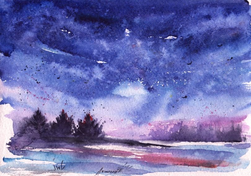 Зимний пейзаж акварель по сырому