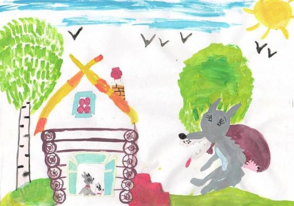 ![Иллюстрация к сказке волк и семеро козлят раскраска]()