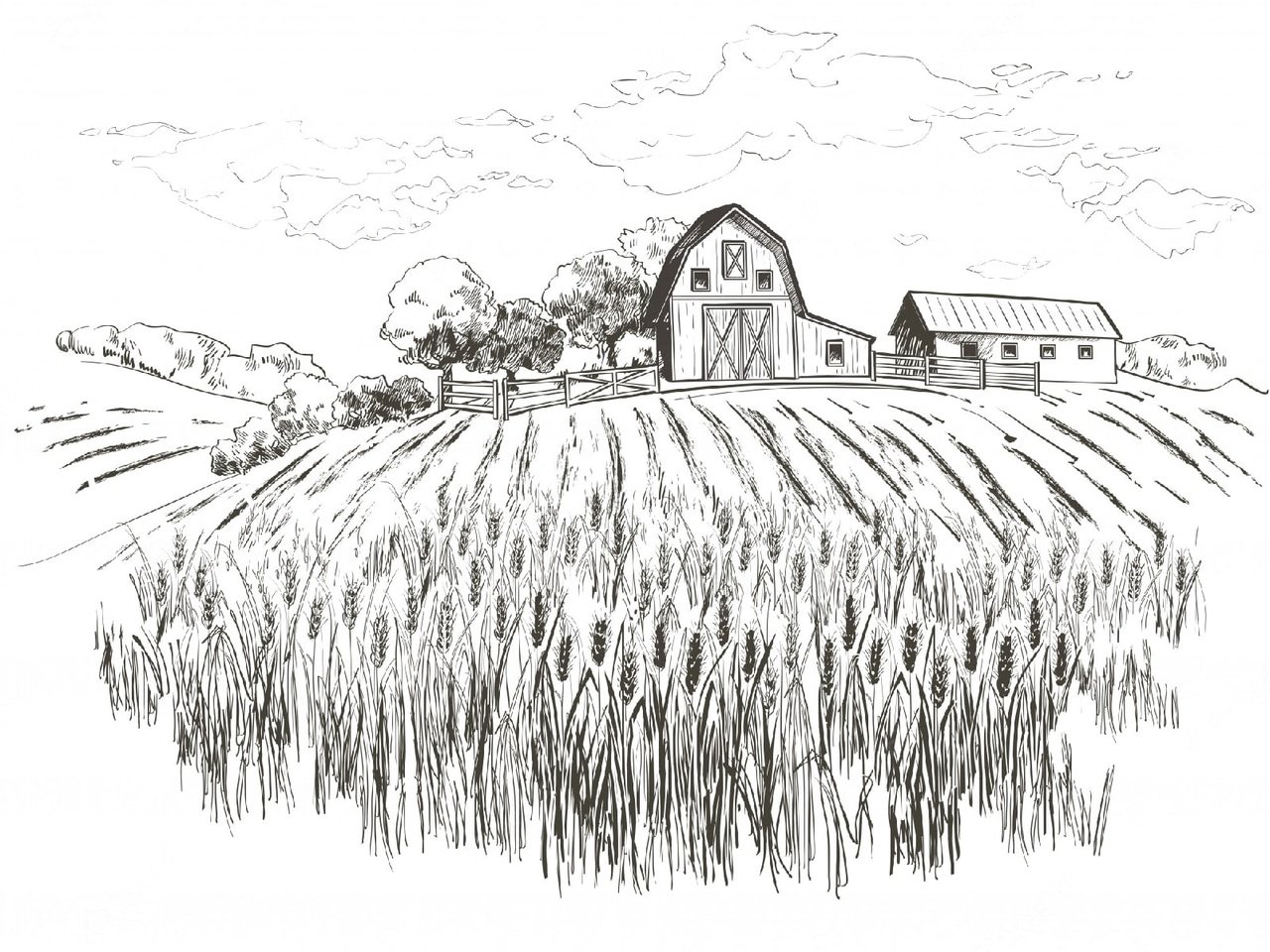 Сельский пейзаж карандашом