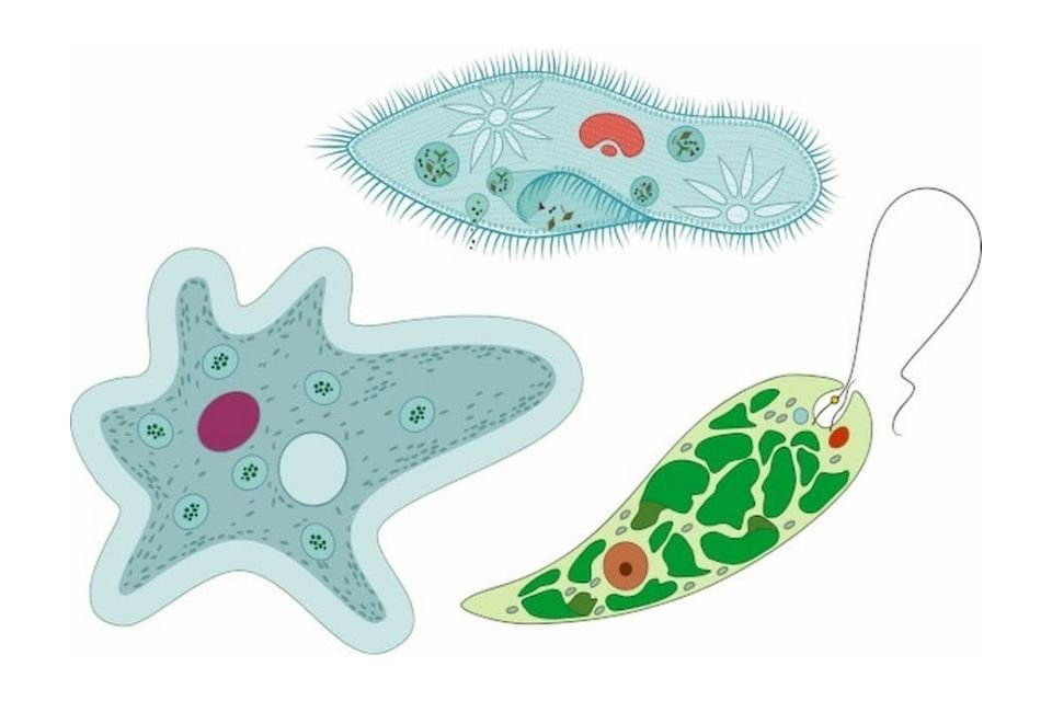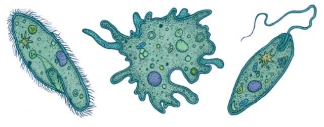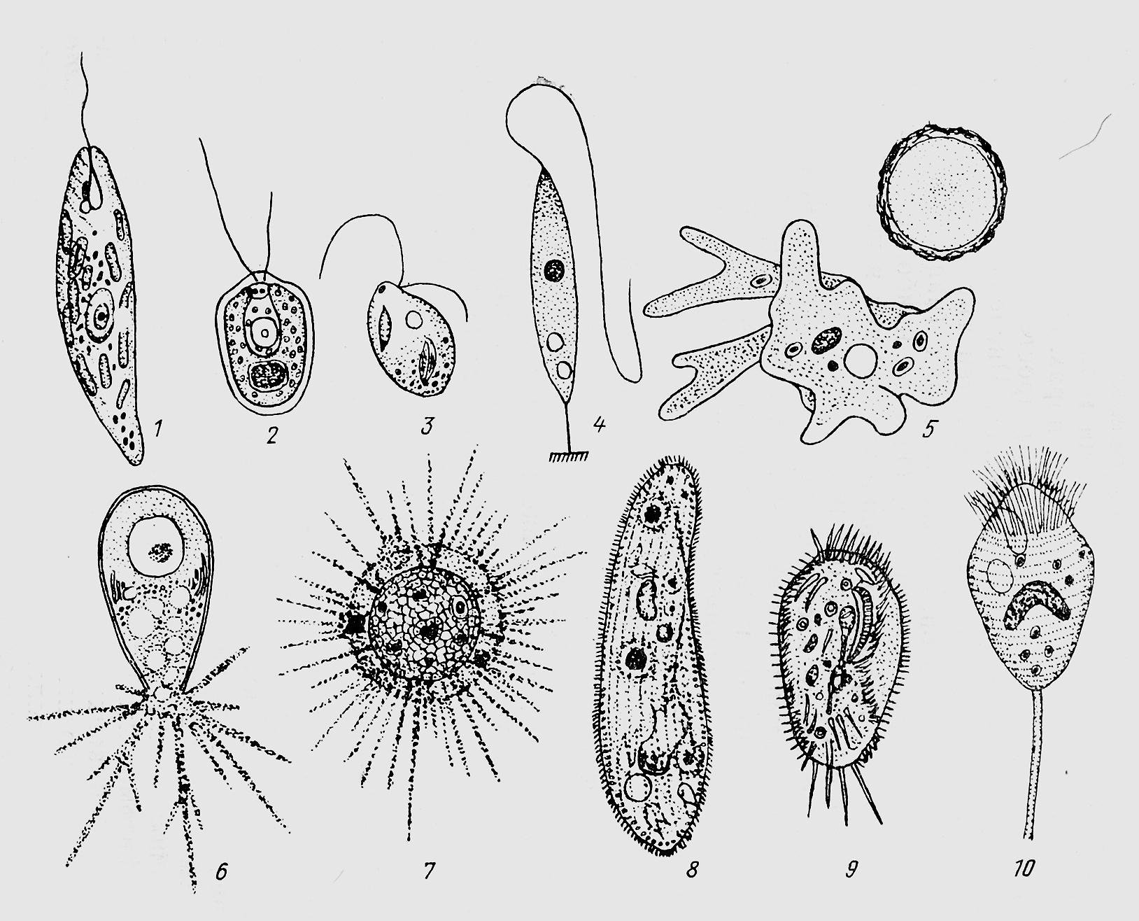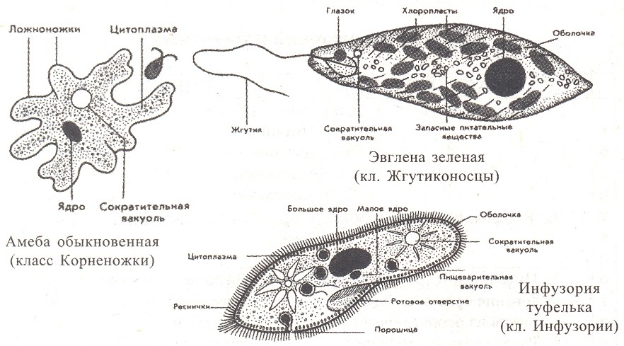 ![Строение амебы эвглены зеленой и инфузории туфельки]()