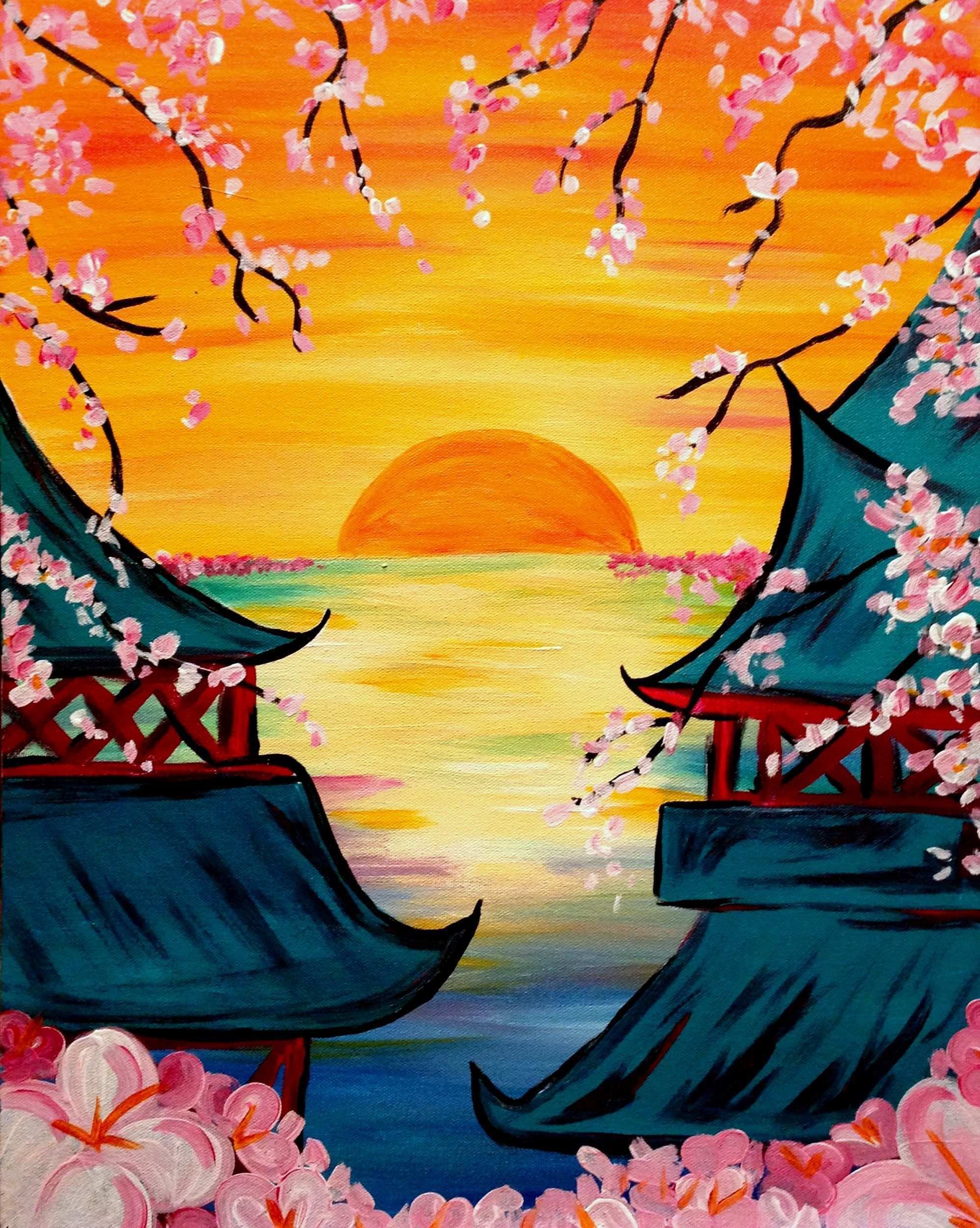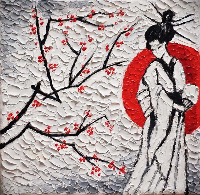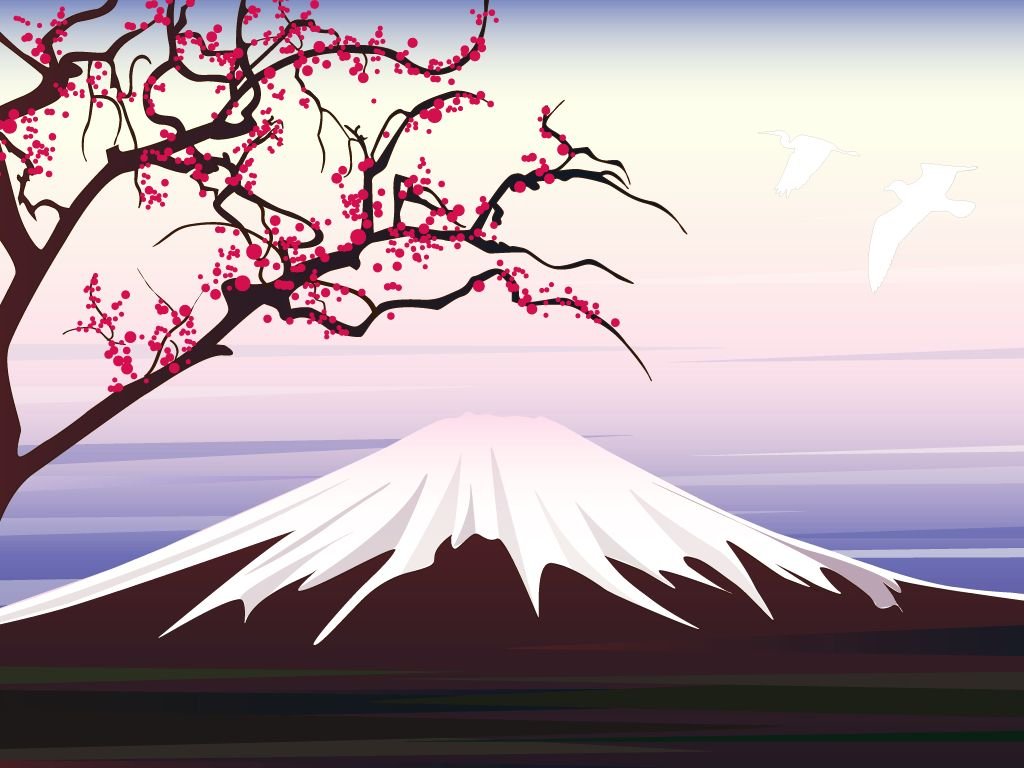 Японская традиционная Суми-э живопись. Гора Фудзи, Сакура