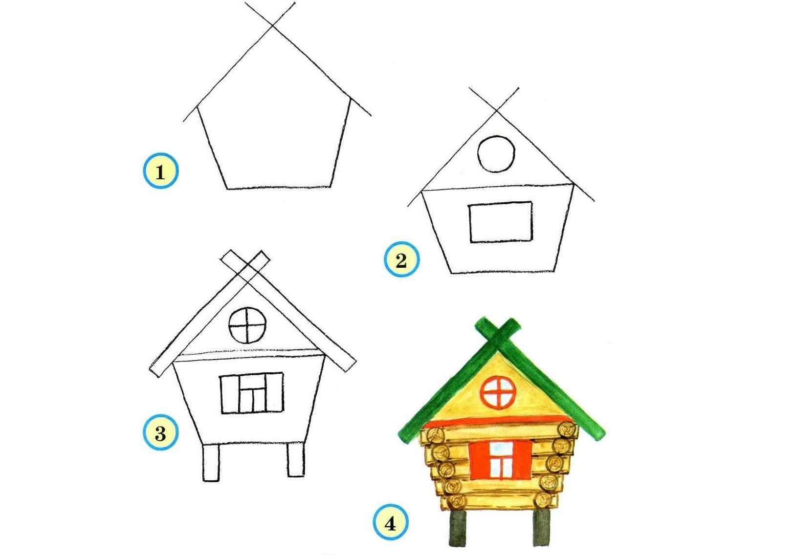 Нарисовать избушку на курьих ножках поэтапно и карандашом