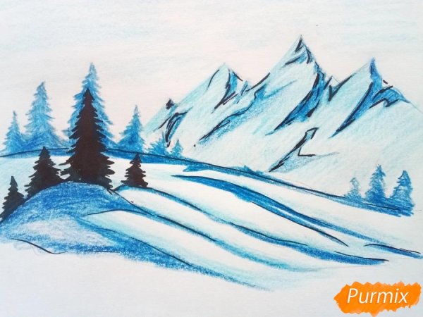 ![Зимний пейзаж елочки рисунок карандашами]()