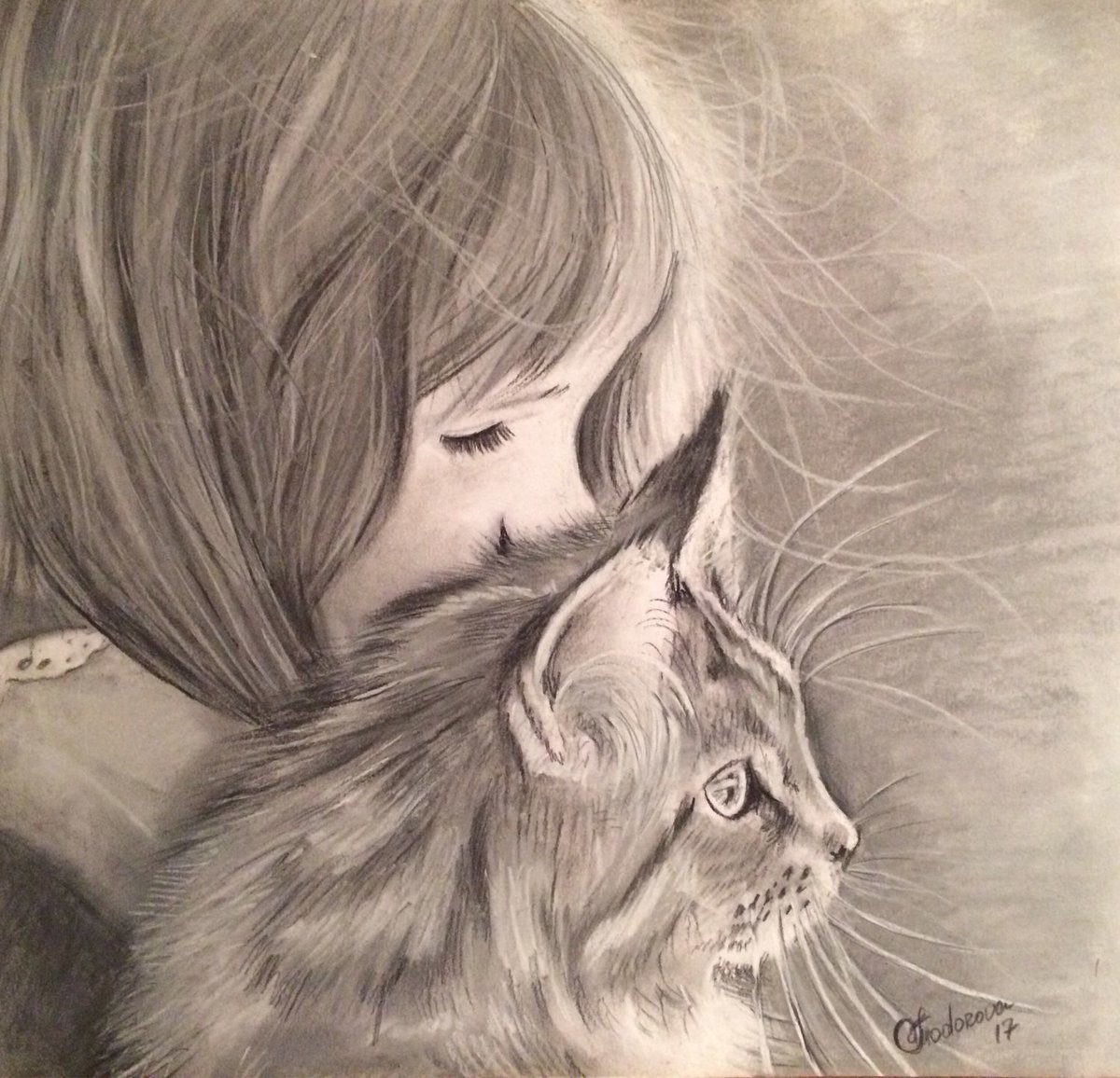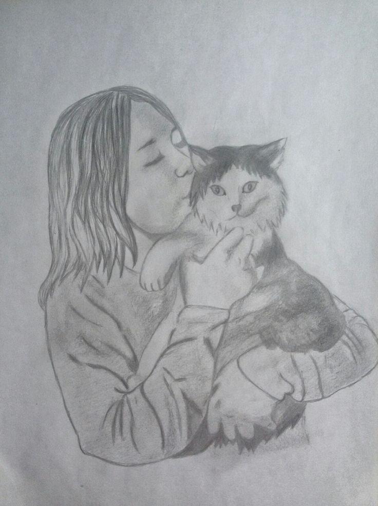 ![Девушка с котом рисунок карандашом]()