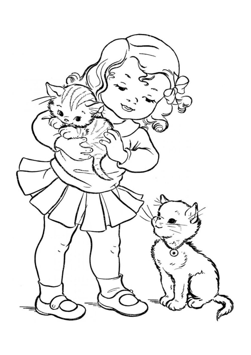 Девочка с котенком раскраска для детей