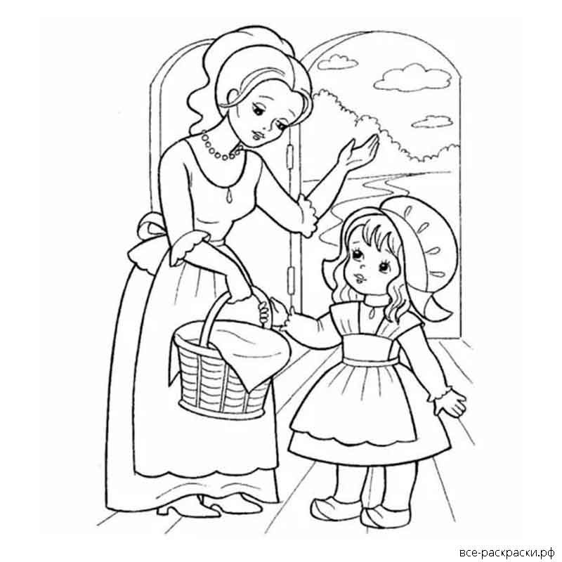 ![Раскраска к сказке красная шапочка Шарль Перро]()