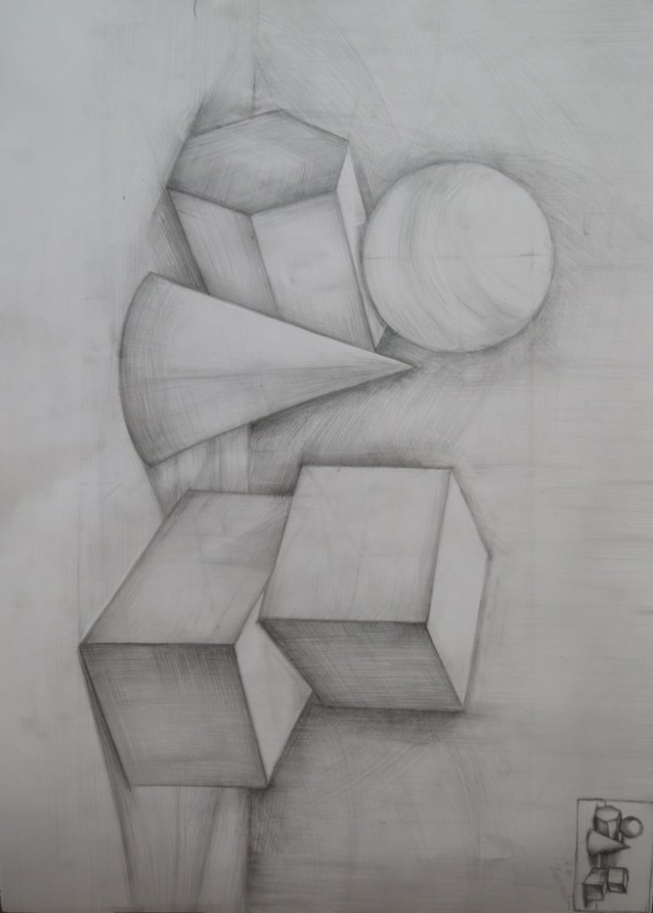 ![Натюрморт из геометрических форм (куб, конус, шар), Графика.]()