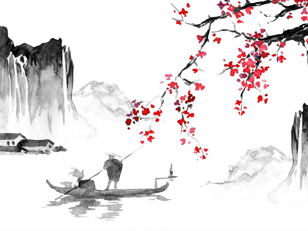 Японская традиционная Суми-э живопись. Гора Фудзи, Сакура