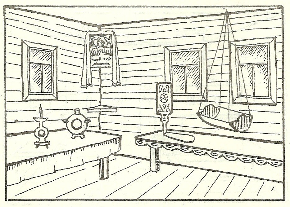 ![Иллюстрация внутреннего убранства избы]()