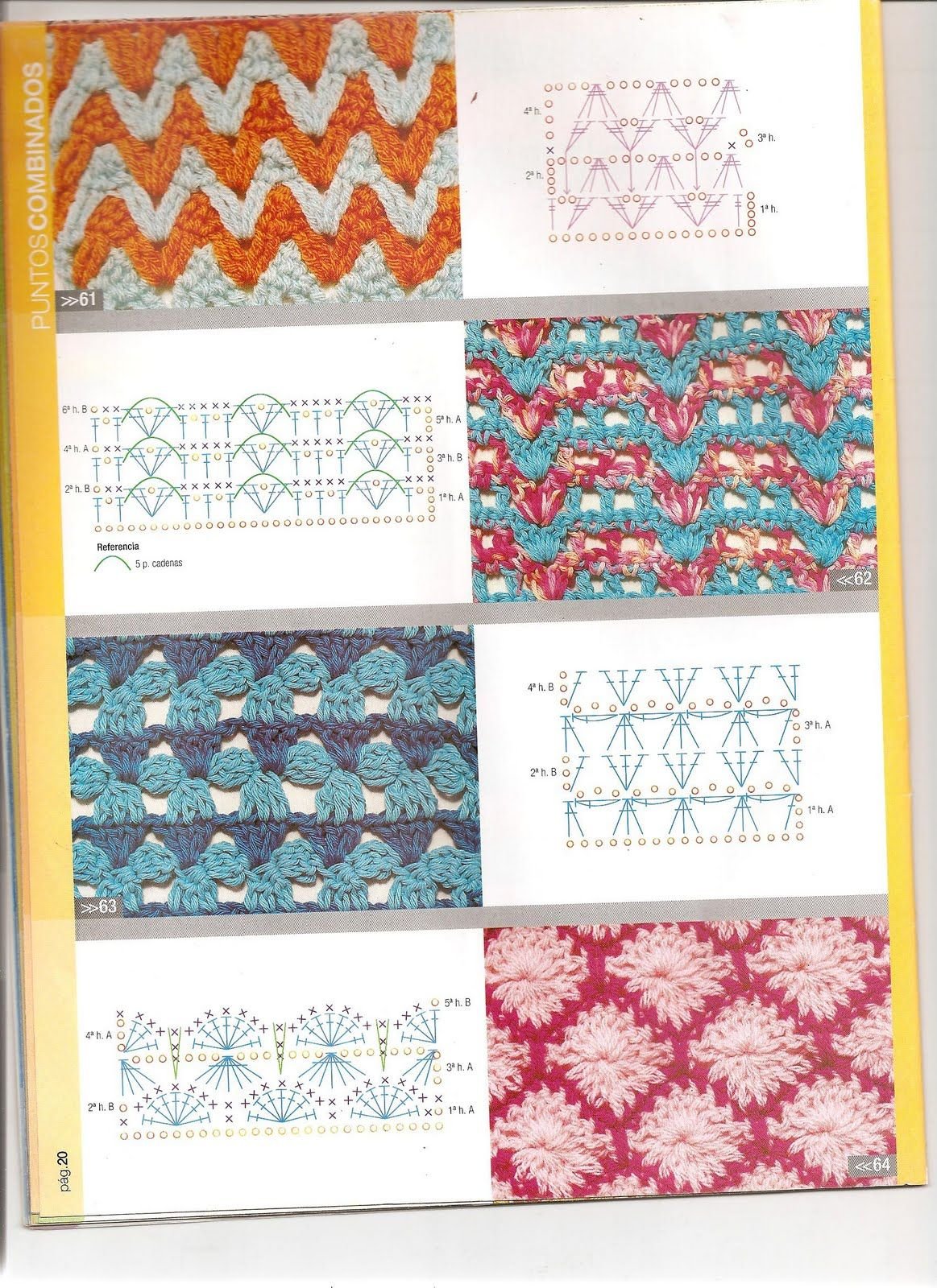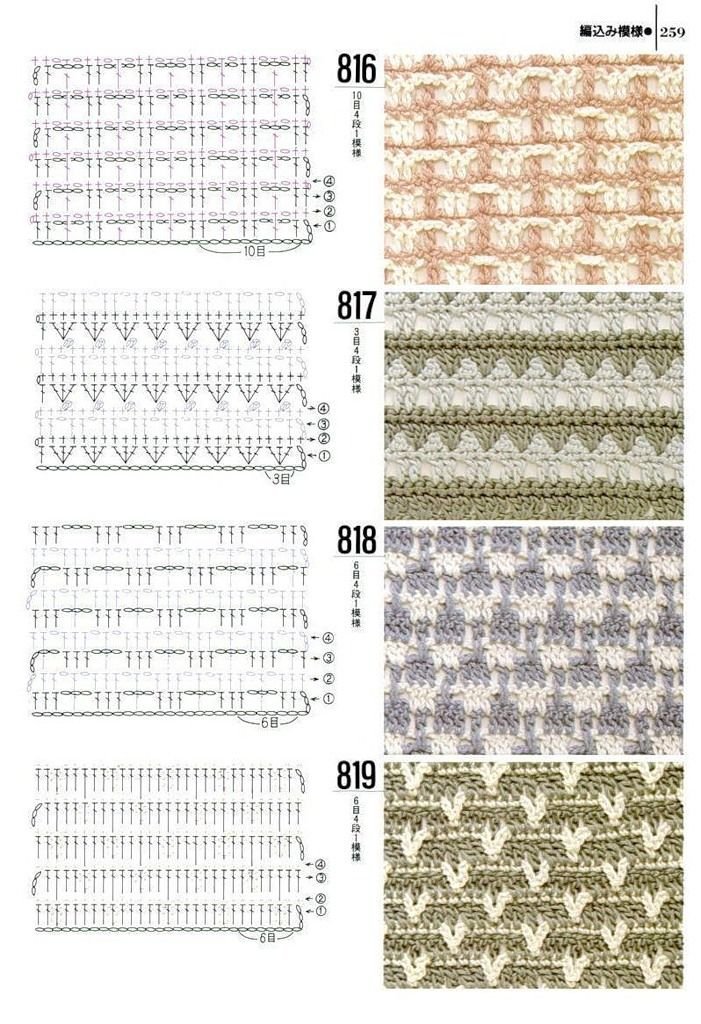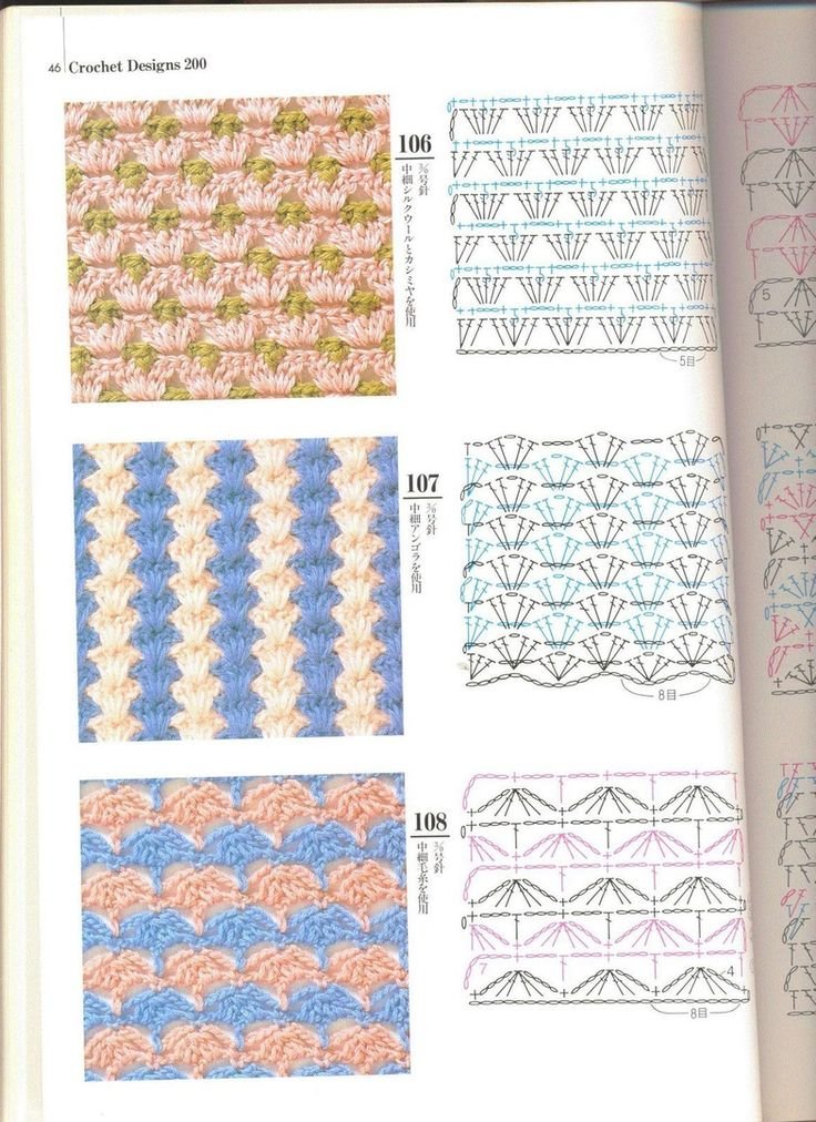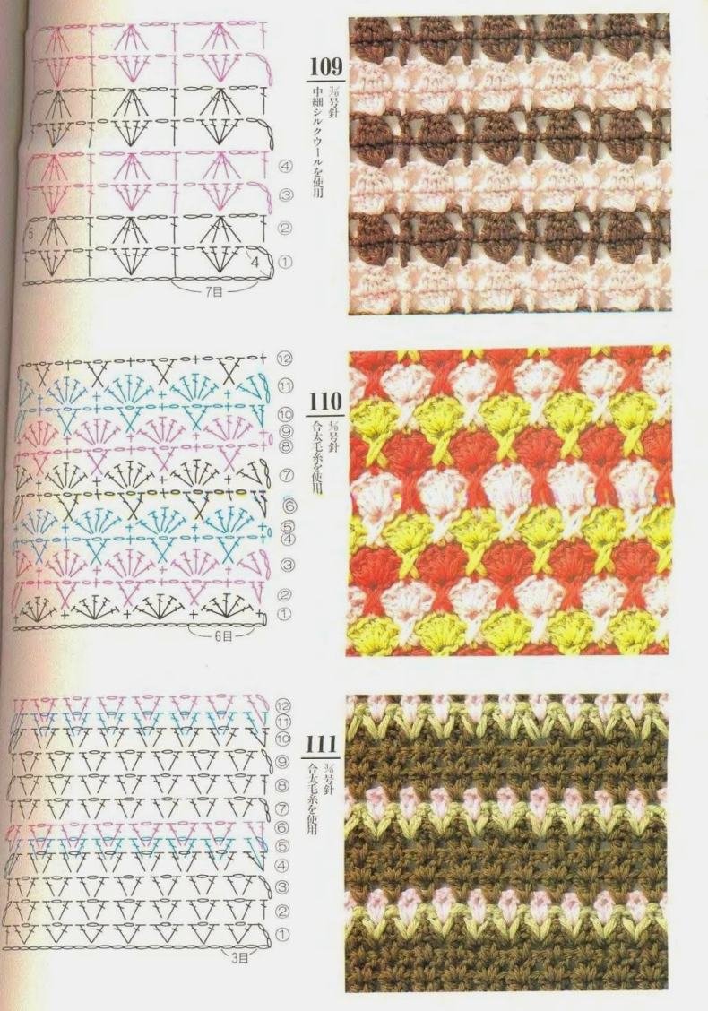 ![Многоцветные узоры крючком со схемами]()