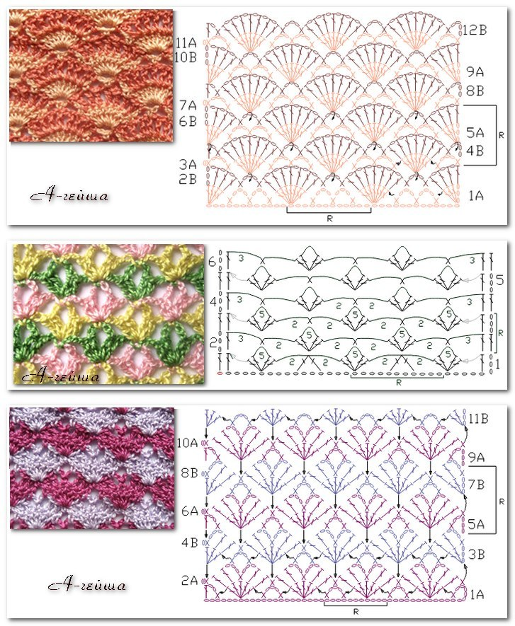 Трехцветные узоры крючком со схемами