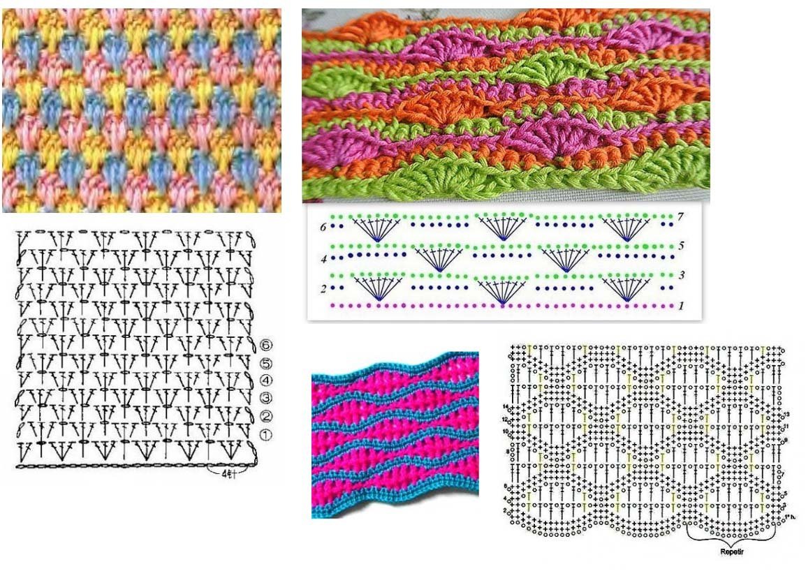 Многоцветные узоры крючком со схемами