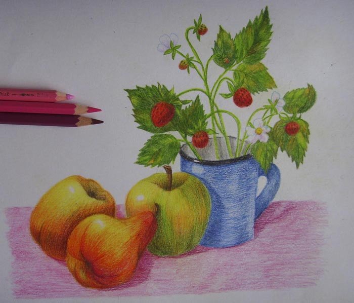 ![Натюрморт с фруктами цветными карандашами]()