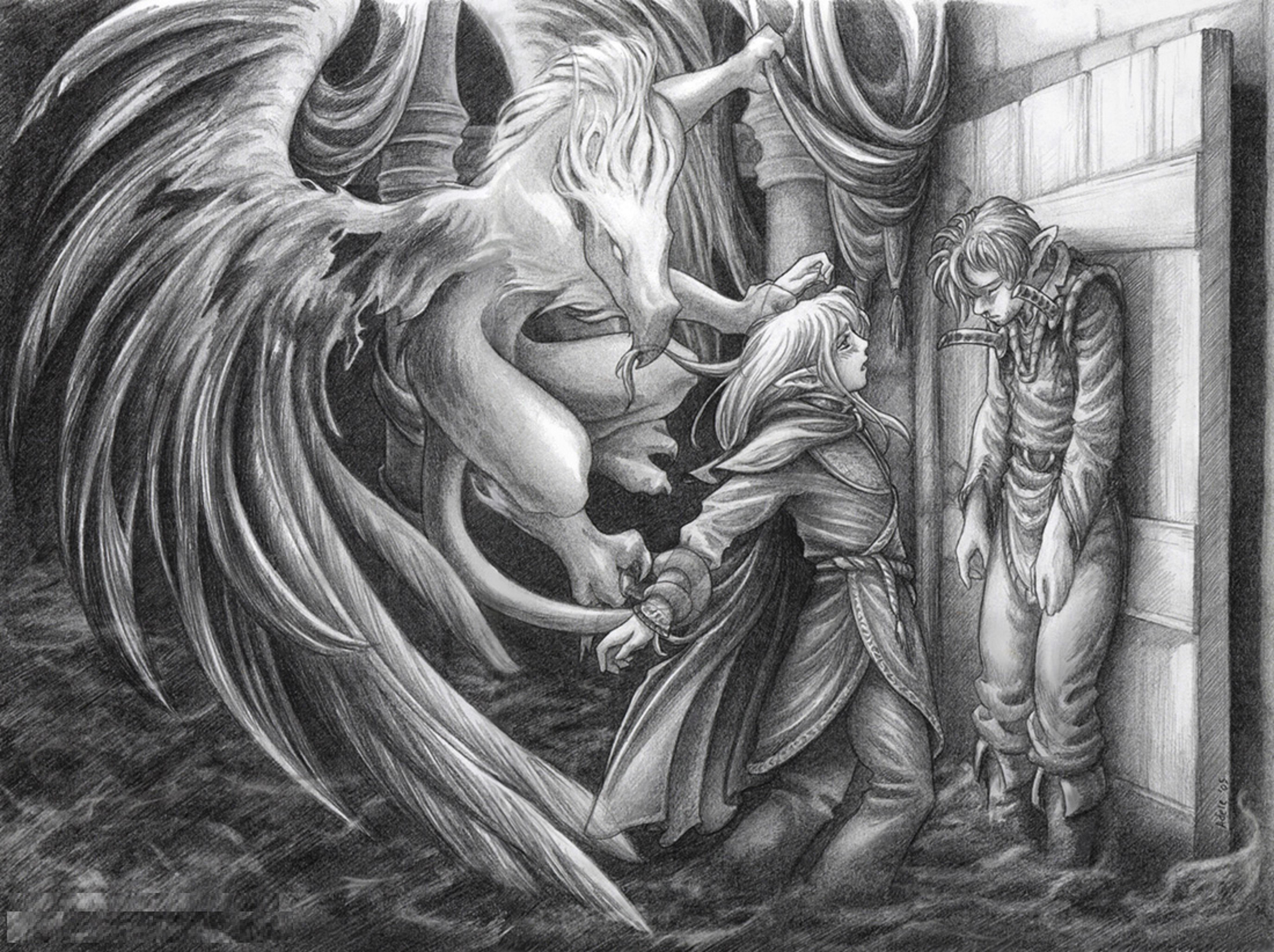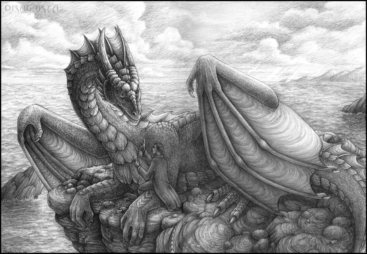 ![Девушка и дракон карандашом]()