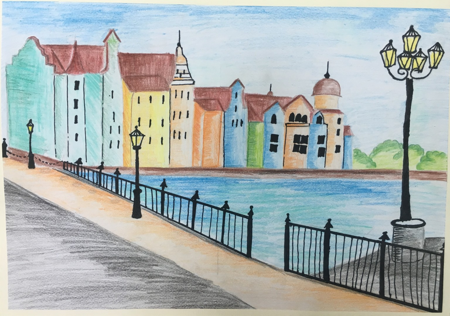 ![Городской пейзаж цветными карандашами]()