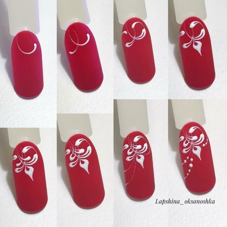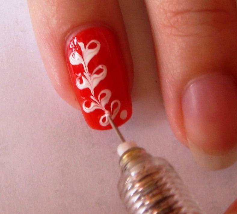 ![Красные ногти с белым рисунком]()