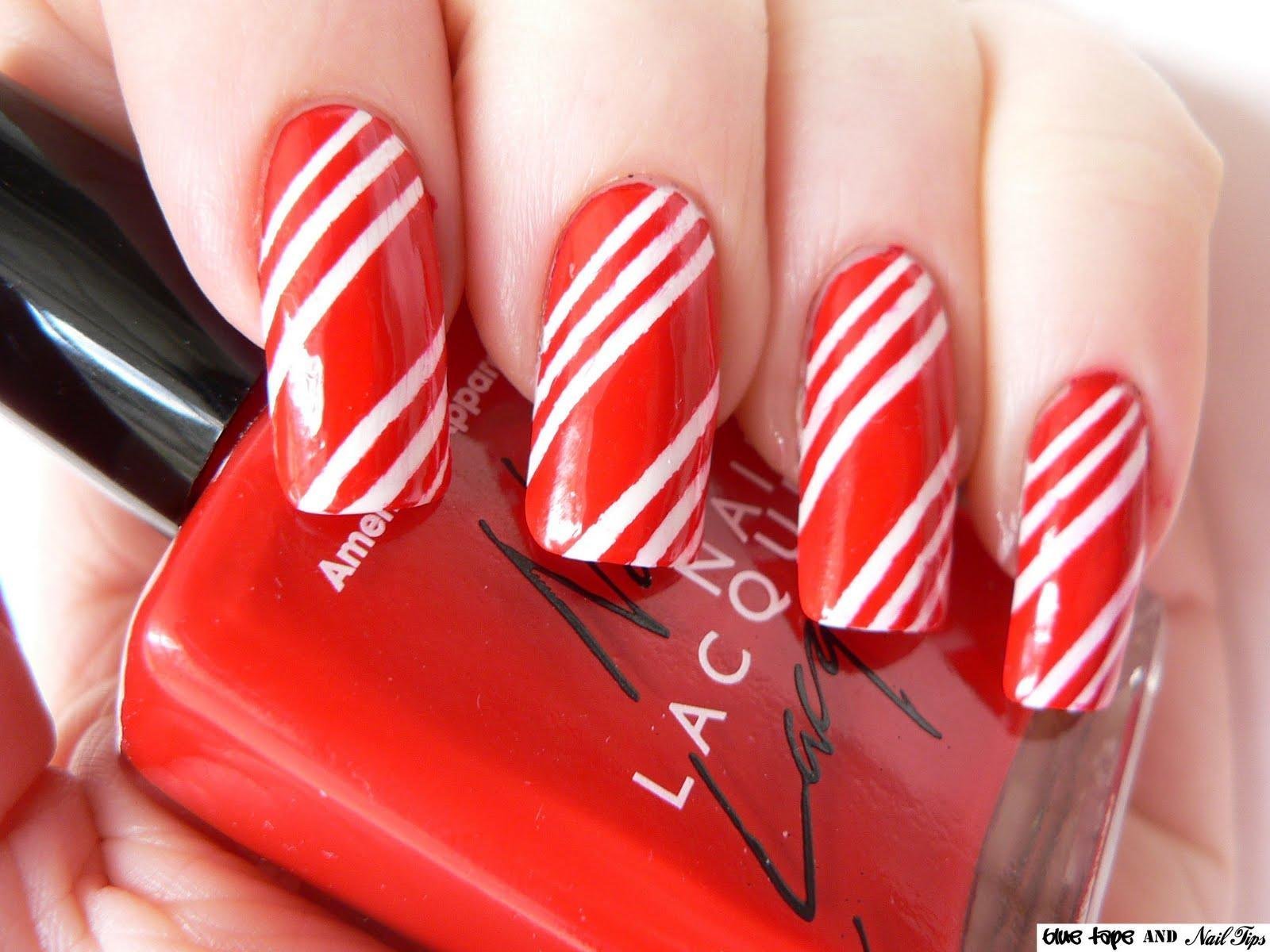 ![Новогодний маникюр с бело красными полосками]()