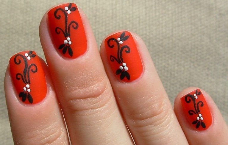 ![Красный маникюр с маленькими цветочками]()