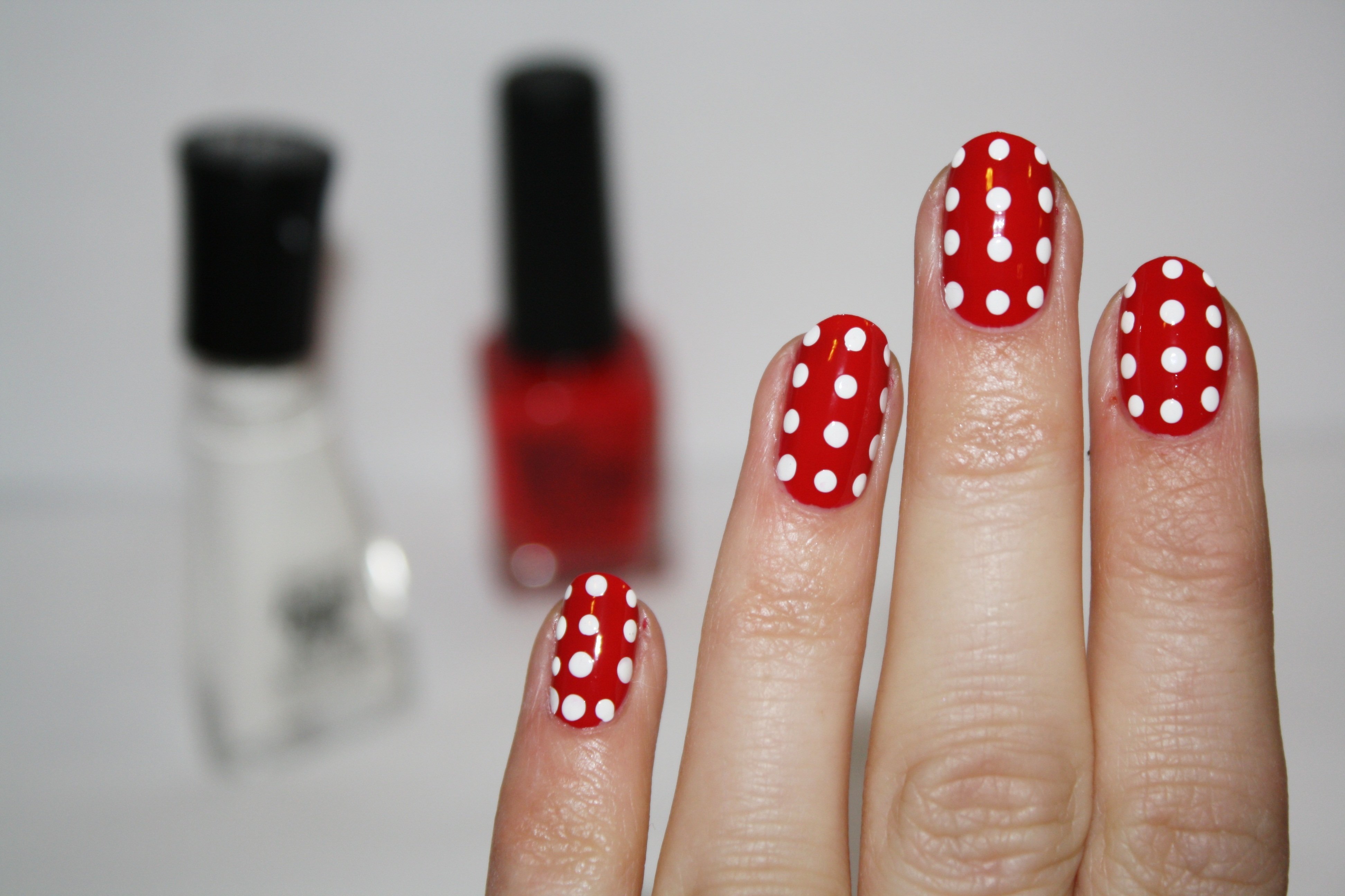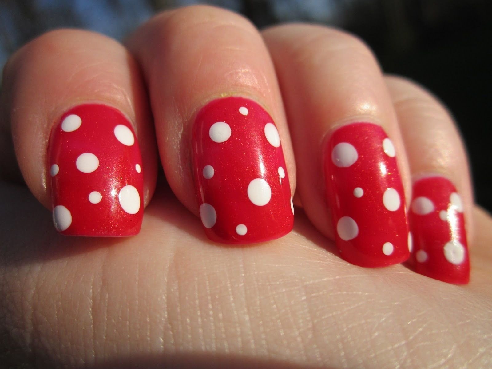 ![Красный маникюр с белыми точками]()