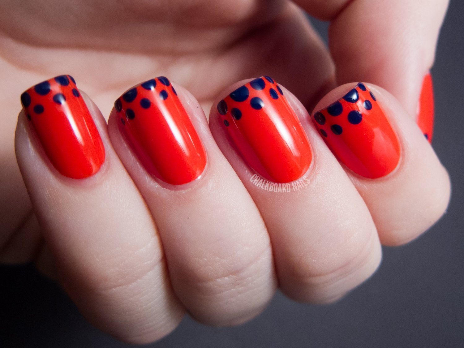 ![Красный маникюр с точками]()