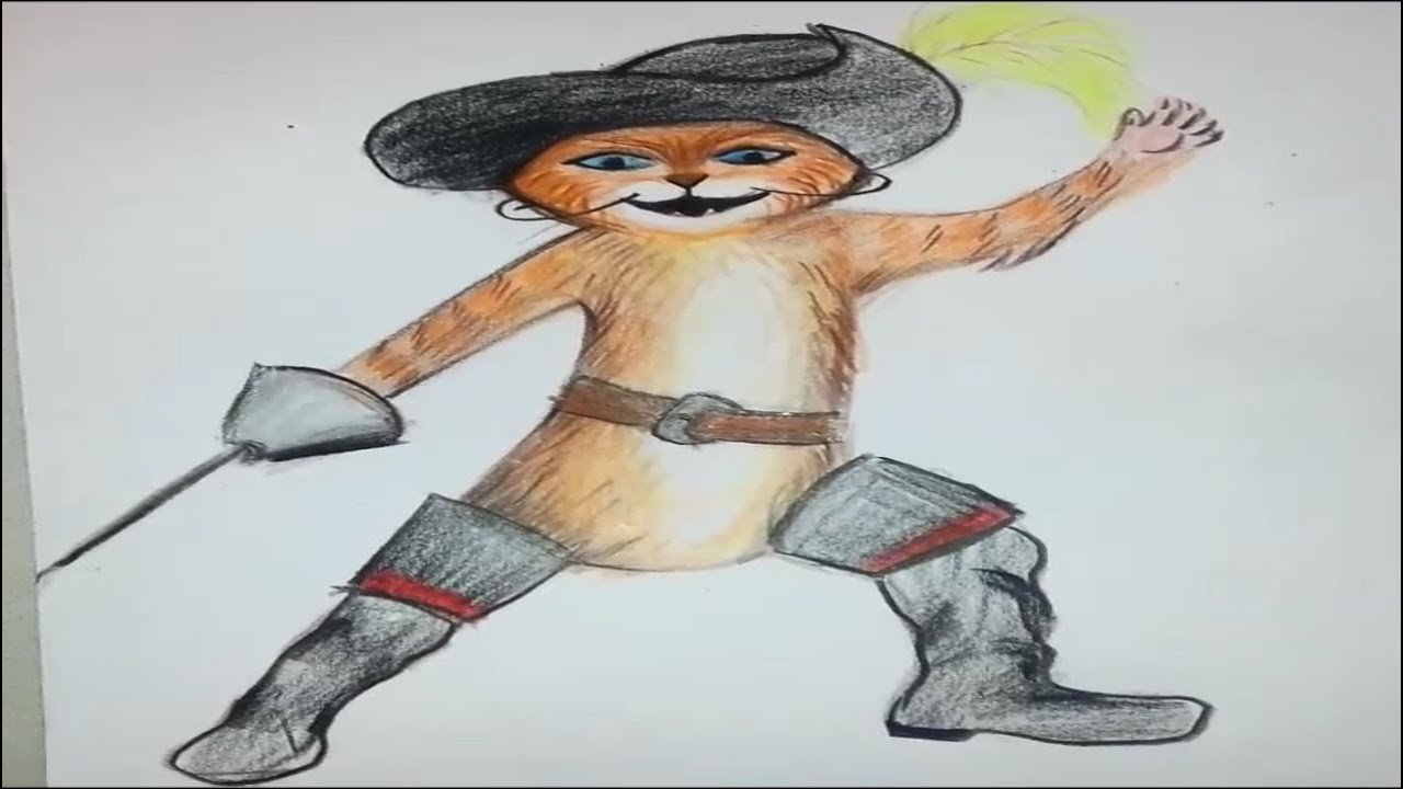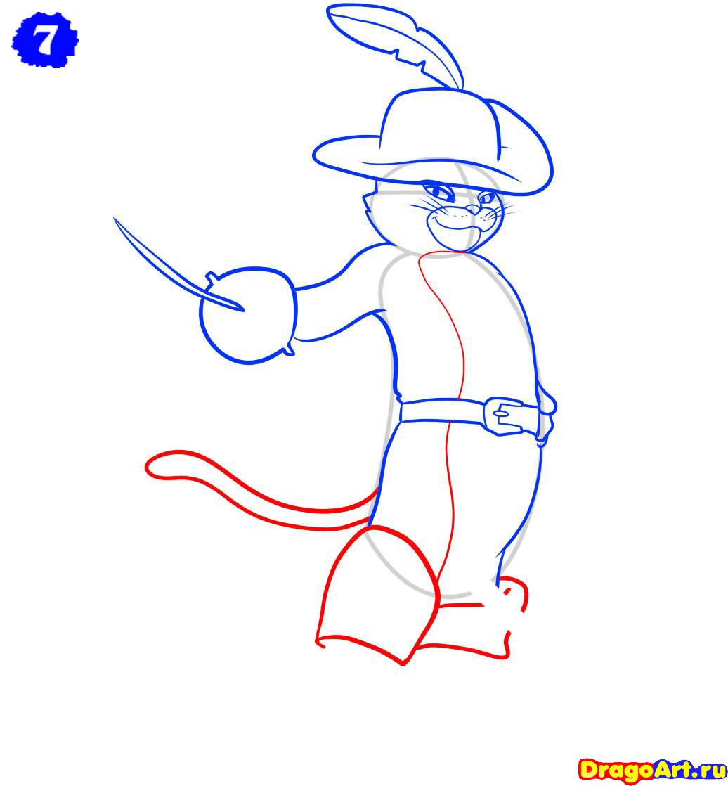 ![Кот в сапогах рисунок карандашом поэтапно]()