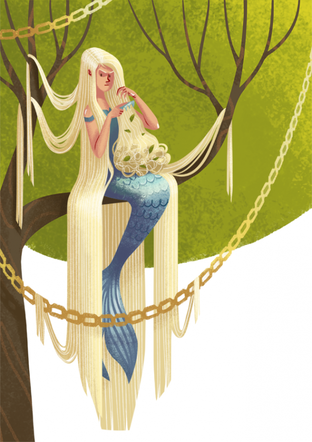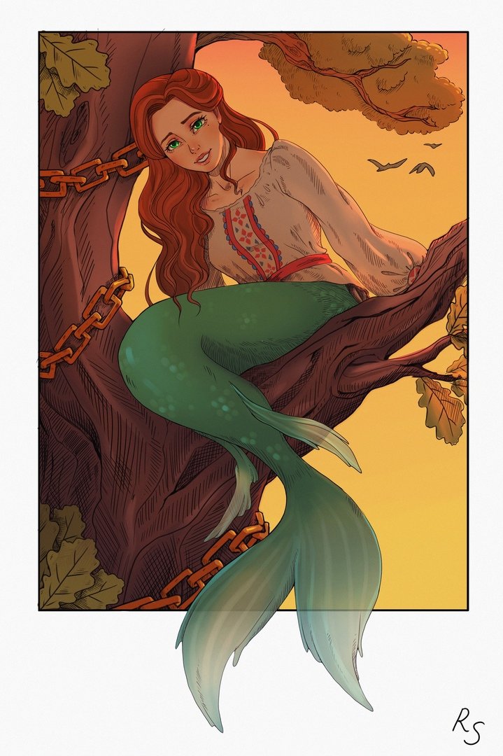 ![Кот учёные на дубе том Русалка на ветвях сидит рисунок]()