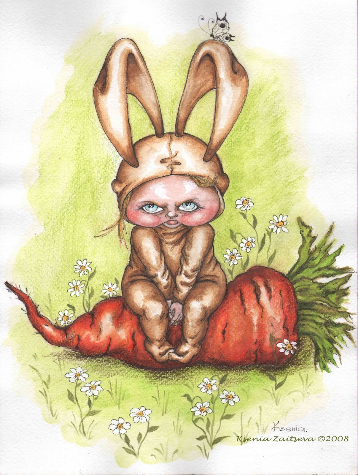 Заяц с морковкой акварель