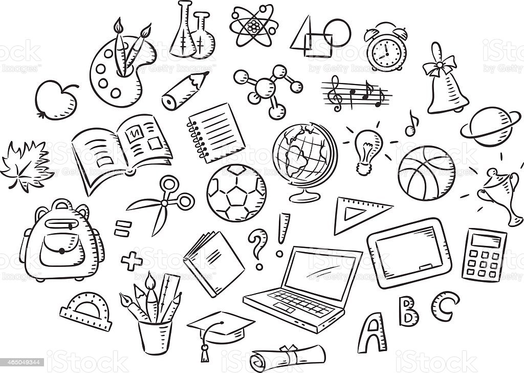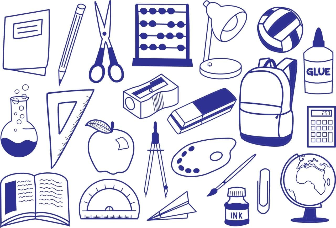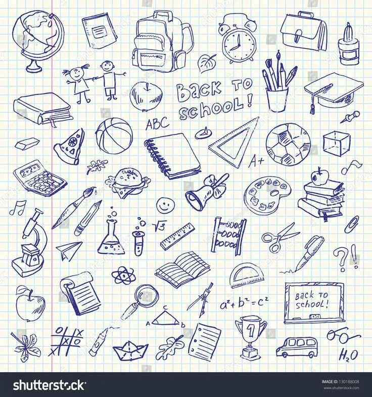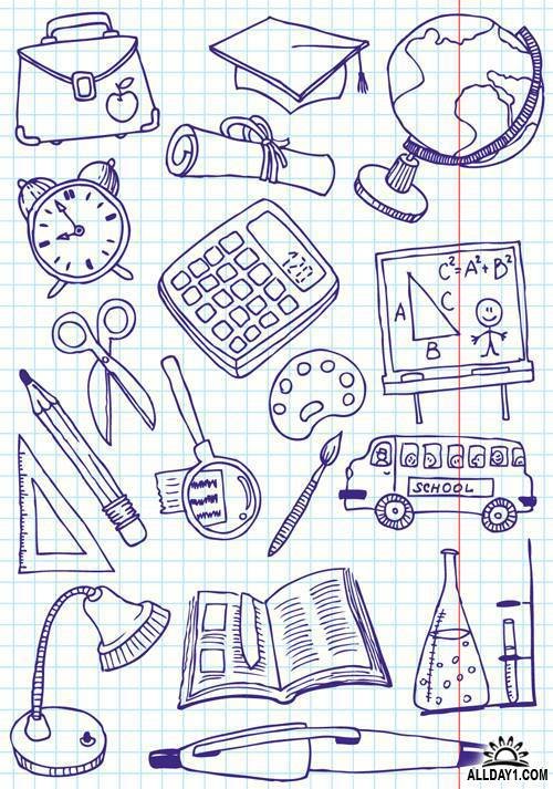 ![Зарисовки школьных принадлежностей]()