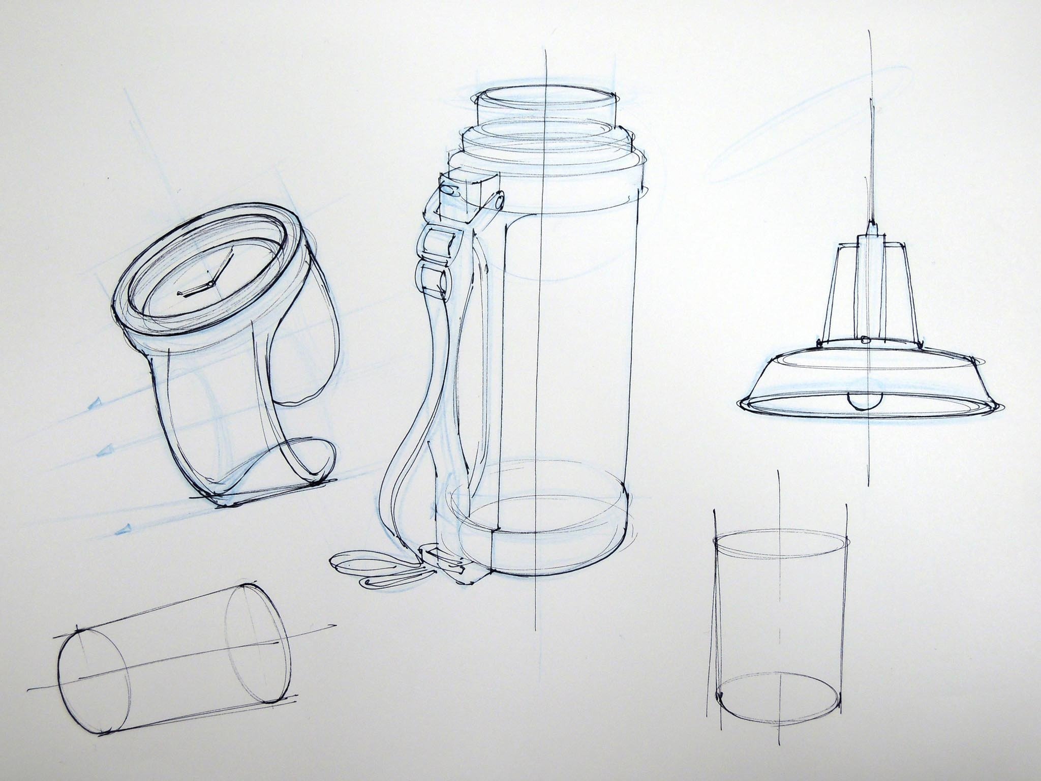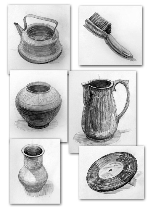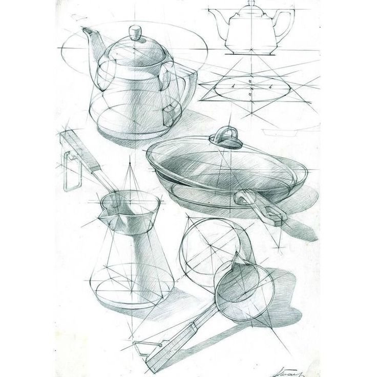 ![Линейно конструктивные зарисовки бытовых предметов]()