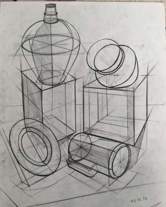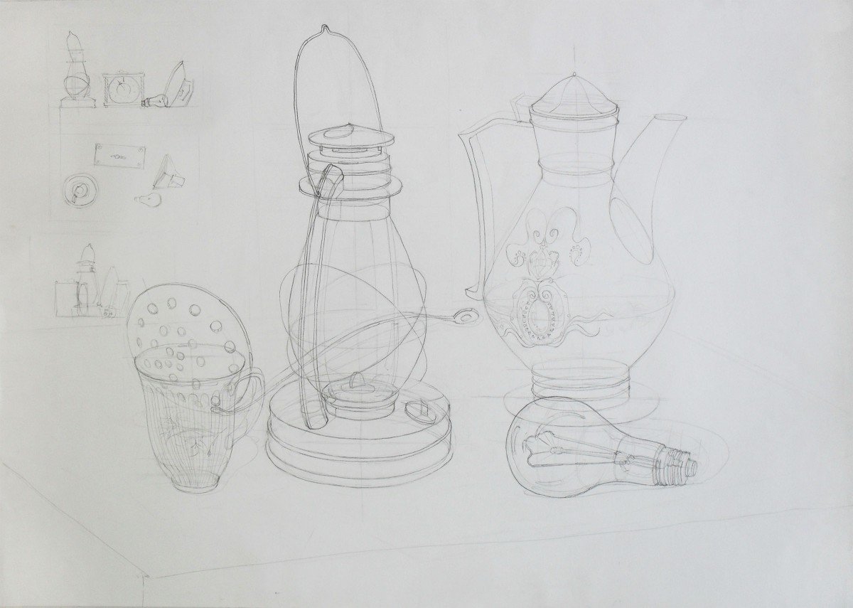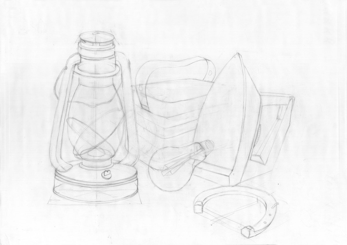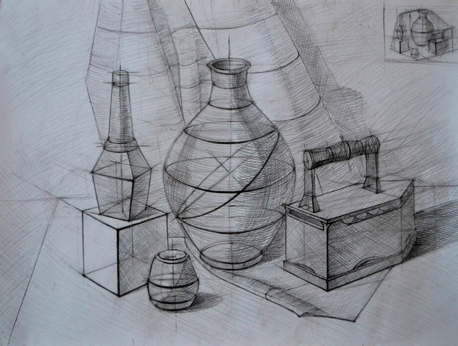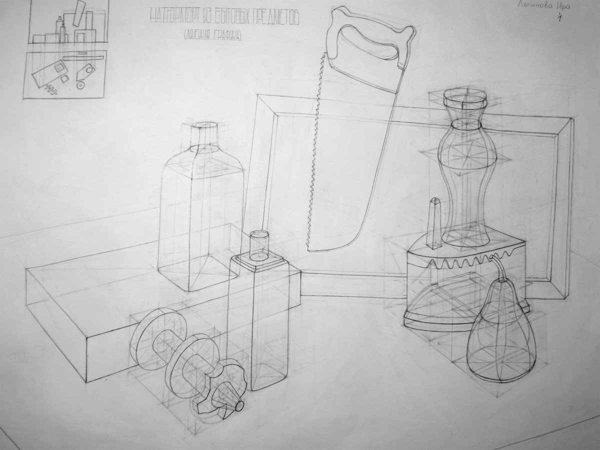 ![Линейно конструктивный натюрморт бытовых предметов]()