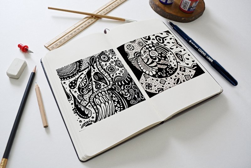 ![Рисунки линером в блокноте]()