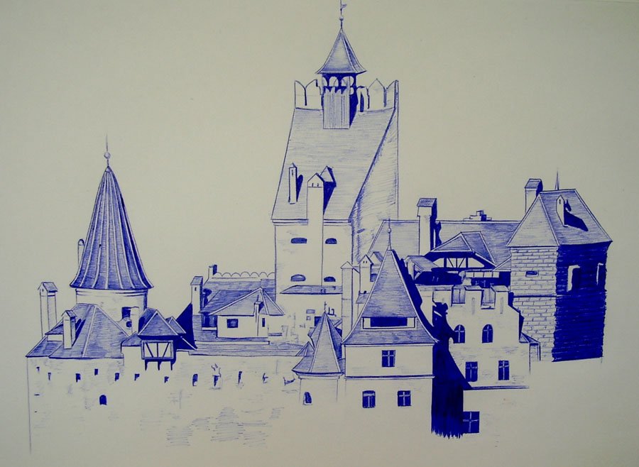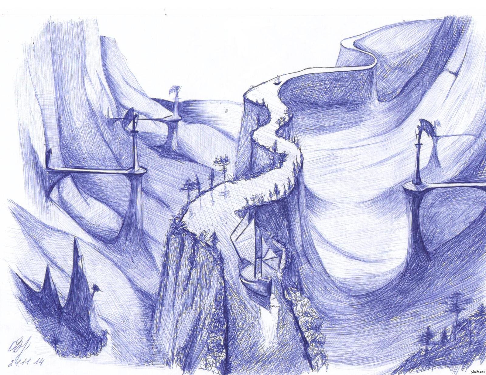 ![Пейзаж синей ручкой]()