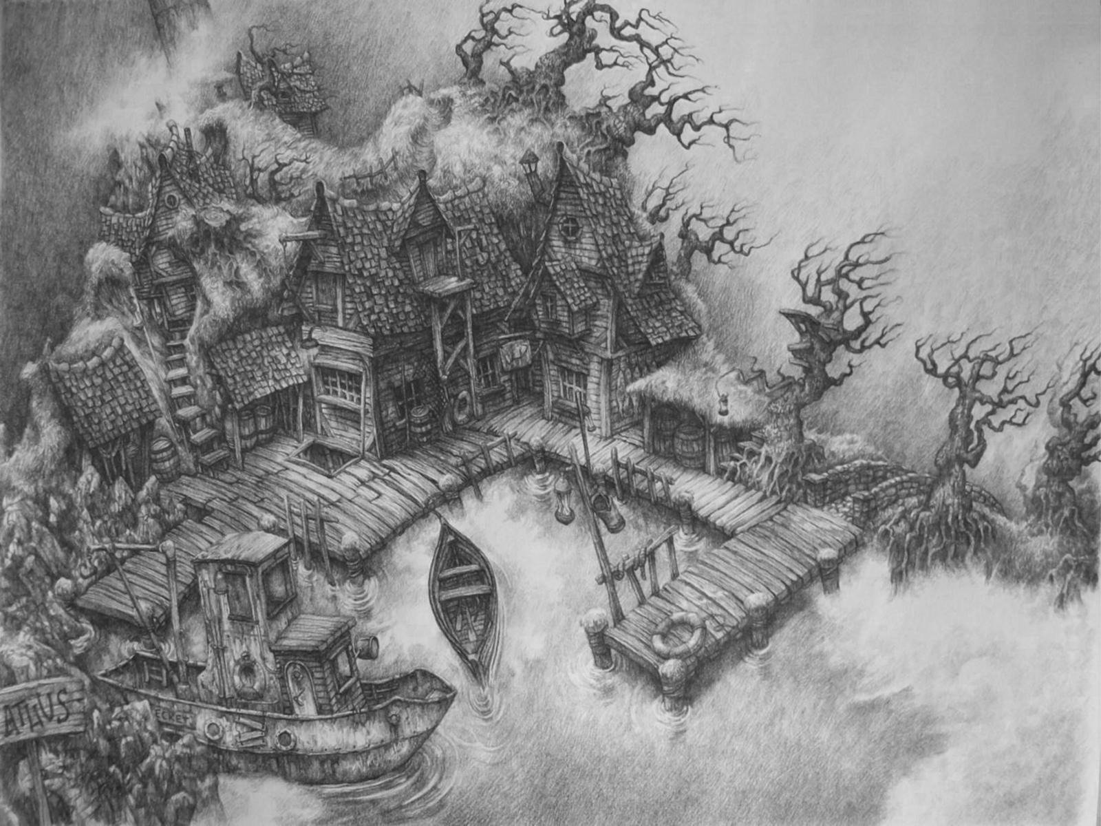 Фантастический пейзаж карандашом