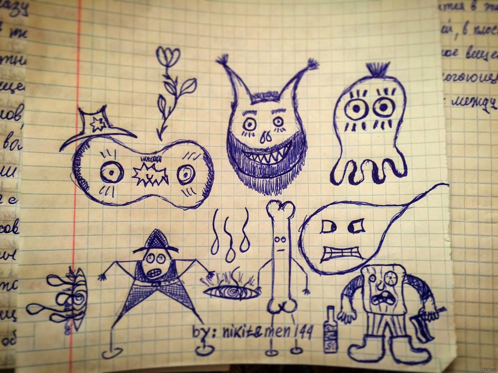 ![Тетрадный лист с рисунками ручкой]()