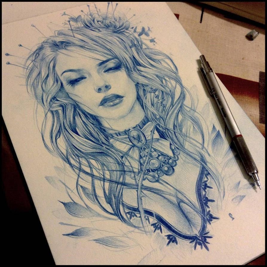 ![Рисунок ручкой на бумаге девушка]()